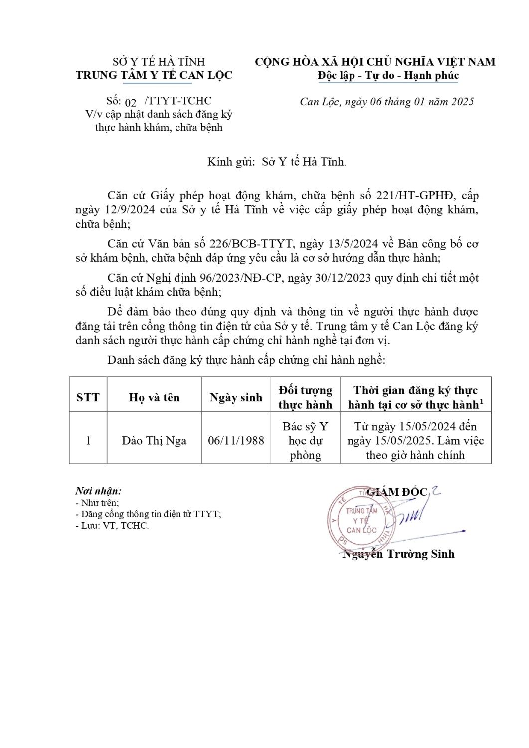 Để đảm bảo theo đúng quy định và thông tin về người thực hành được đăng tải trên cổng thông tin điện tử của Sở y tế. Trung tâm y tế Can Lộc đăng ký danh sách người thực hành cấp chứng chỉ hành nghề tại đơn vị
